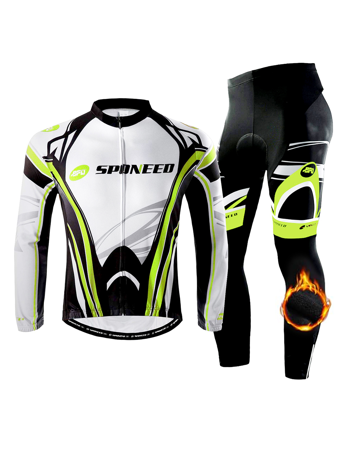 Our Sponeed Cycling Team thermal jersey and tights were designed to meet the demands of cold weather cycling. The high quality, super thermal fleece fabric offers a unique warm fleece interior which provides incredible heat retention and keeps your body warm in the coldest conditions.