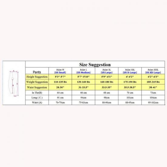 XL:Height(ft): 5’11”-6’2” Weight(lbs):175-190 Waist(A):35.5-38.5” In The(B):27.6” Long(C):40”