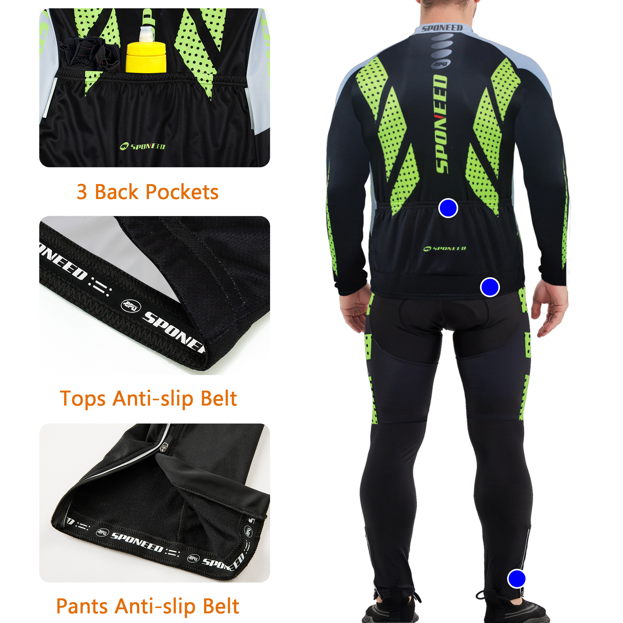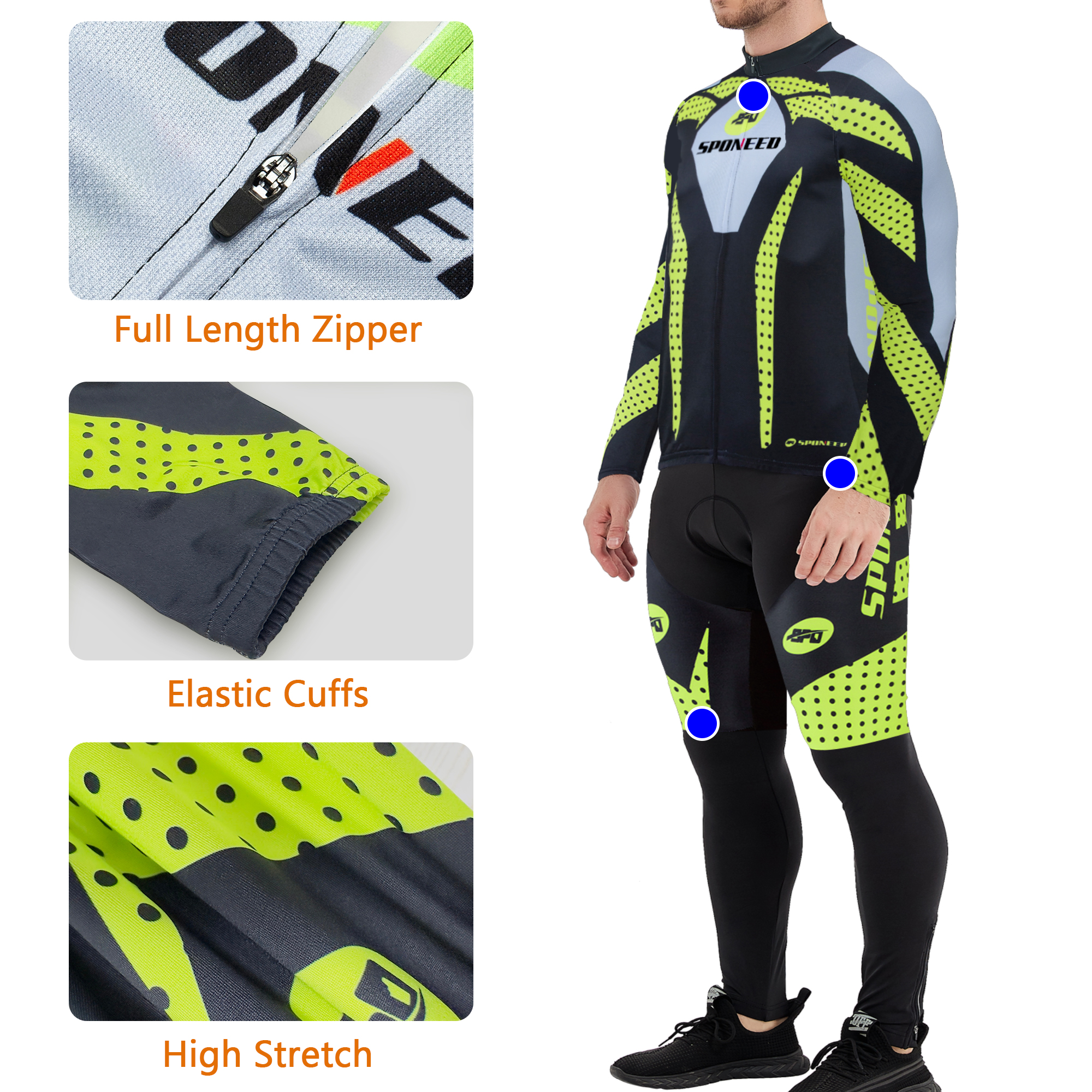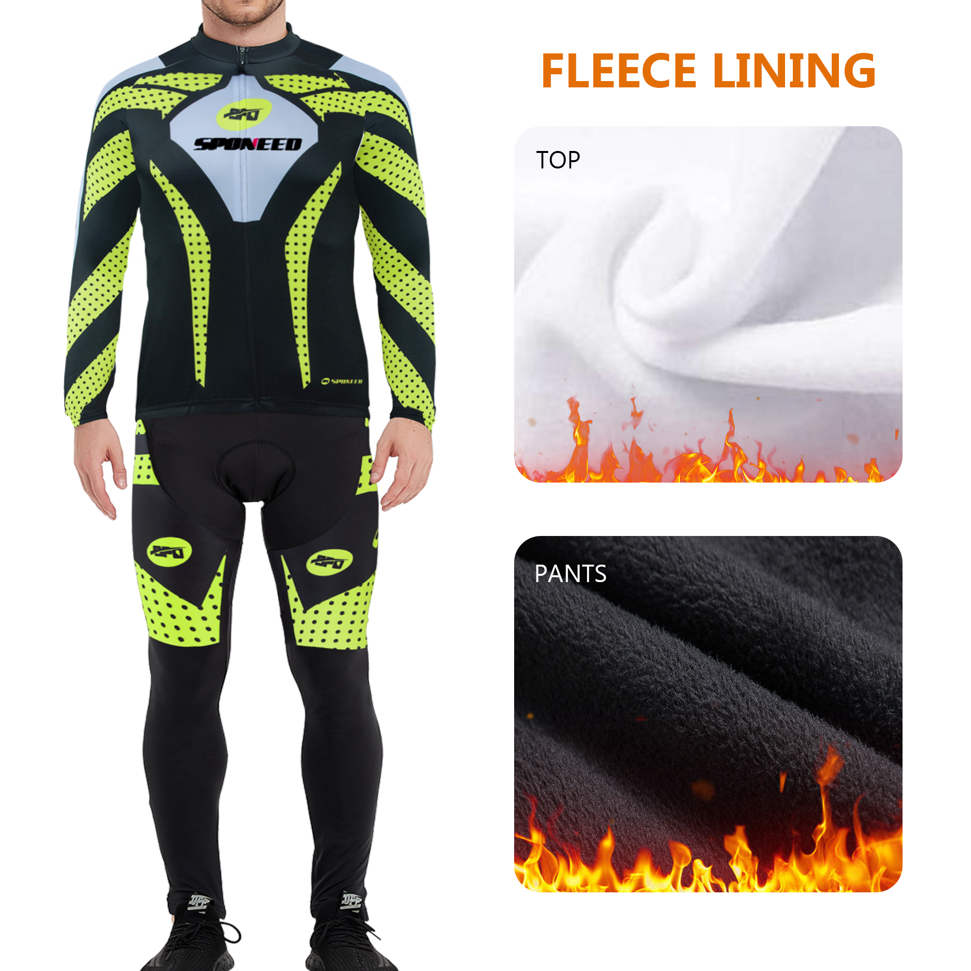 Our Sponeed Cycling Team thermal jersey and tights were designed to meet the demands of cold weather cycling. The high quality, super thermal fleece fabric offers a unique warm fleece interior which provides incredible heat retention and keeps your body warm in the coldest conditions.