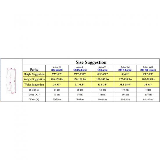 3XL:Height(ft):6’3”-6’5” Weight(lbs):195-240 Waist(A):39-42.5” In The(B):29.5” Long(C):40.9”