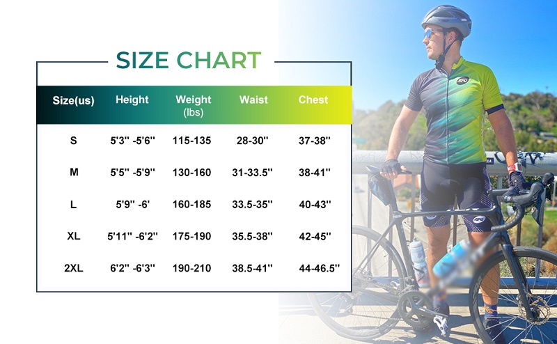 The size info is for reference based on weight, height and waist. Check the detailed cycling uniform measurement for the correct size. The item color displayed in pictures may appear different on your computer monitor as monitors are not calibrated the same.